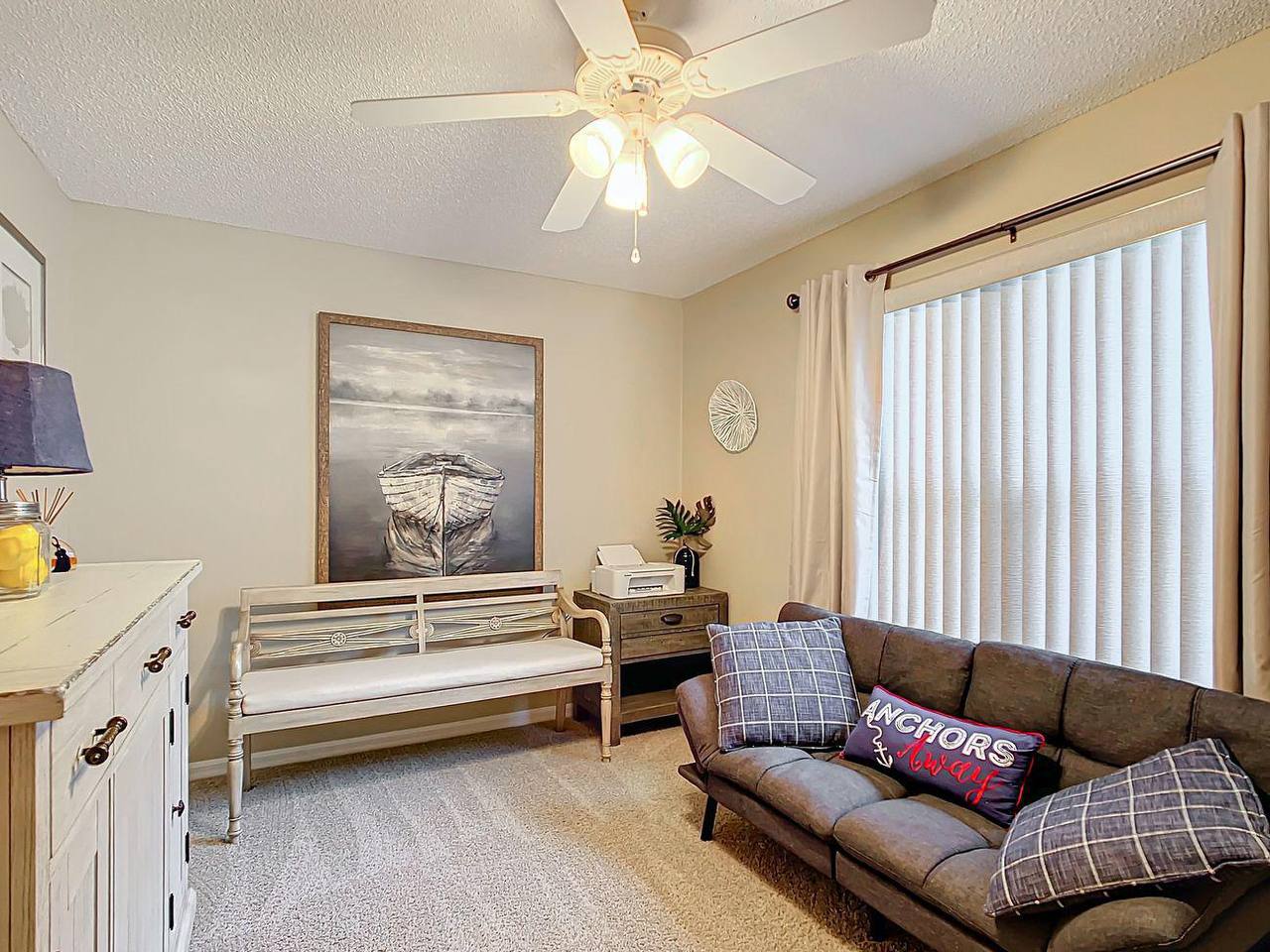 This home is ideally located close to several town squares: Sumter Landing (1.2 miles), Spanish Springs (3.8 miles), Brownwood Paddock (4.2 miles), and Sawgrass Grove (9.2 miles), all accessible by golf cart! Each town square offers nightly entertainment and a variety of restaurants to enjoy. Within walking distance to the Sabal Chase swimming pool (0.3 miles) for a refreshing dip, and conveniently located down the road from Canal Recreation Center, pickleball courts, and country clubs. There are many champion and executive golf courses, Palmer Legends Country Club, and Nancy Lopez Legacy Golf & Country Club. This home is decorated with nautical decor, living room has two couches and a comfortable chair, master bedroom has a king size bed with master bathroom. The guest bedroom has a queen size bed, dresser, and the third bedroom is an extra room with a futon, wireless printer, and can be utilized as an additional bedroom or office.